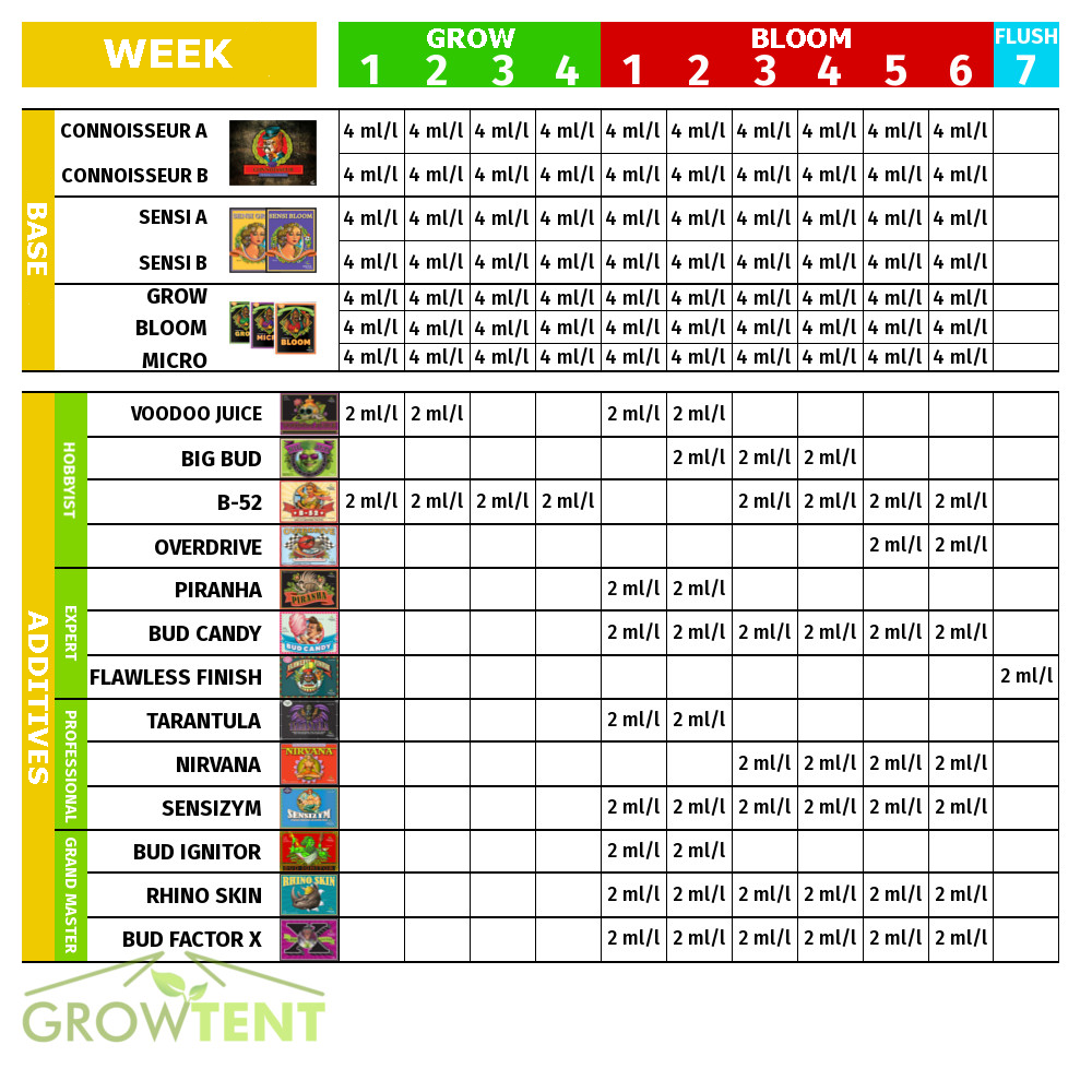 Below you will find a table showing an example of the dosage of Advanced Nutrients fertilizers.