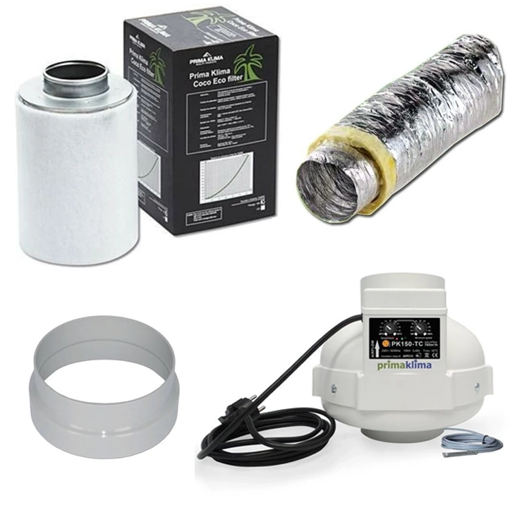 Fan - built-in thermostat (from 20st. C to 30st. C), - temperature sensor on the wire, - speed control (from 50% to 100%) - capacity: 800m3/h, - connection: Ø160mm, - power: 100W, - suitable for continuous operation, - made of ABS plastic, - weight 4kg, Carbon filter Prima Klima Flange: 160 mm Ventilation duct: -Length: 2m -Size: 6" (15 cm) |