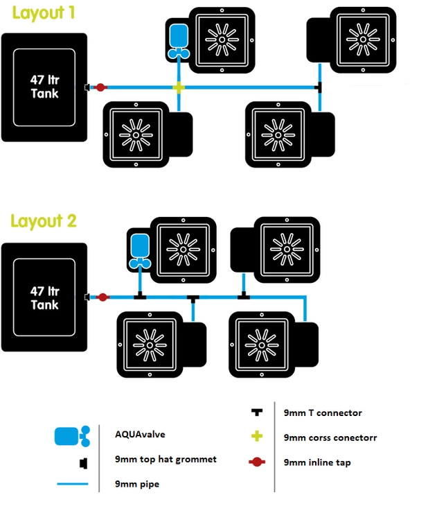 The tank should be placed at least 15cm higher than the pots to allow gravity pressure to effectively water the system.
