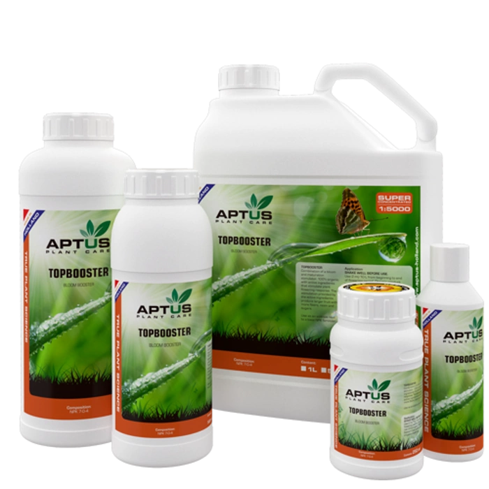 Use and dosage:Topbooster is a synergetic cocktail full of active ingredients that stimulate the full flowering process. Therefore, it is recommended to use Topbooster during almost the entire flowering phase. Topbooster should be used as an additive next to the basic NPK fertilizer 20 ml per 100 litres (1: 5000) from the second until the last week of flowering Topbooster is a 100% organic product. Precautions should be taken when using organic products in drip irrigation systems. In such systems, the organic product increases the risk of blockages. Therefore, you should always use System-Clean when using Topbooster in drip irrigation systems. Tips and Benefits: