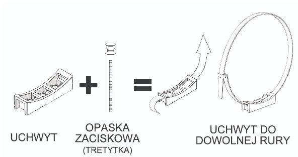 An easy-to-install universal pipe holder that can be fitted to any size of pipe. The only limitation is the length of the band (cable tie). The kit includes: two holders + two bands.