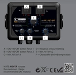 TEMPERATURE CONTROLLER, MINIMUM SPEED (IN&OUT) and NEGATIVE PRESSURE. It allows to control the AIR intake and AIR outtake (extraction) with independent settings and it comes with a temperature sensor.