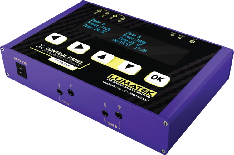 The LUMATEK Control Panel PLUS 2.0 (HID+LED) is a dual signal digital lighting controller that offers precise external control of your Lumatek lighting fixtures, drivers and ballasts. Using innovative technology, this controller smartly monitors your grow room temperatures, light timing & intensity automation, safety-controlled dimming and switching On/Off. Simply connect it to your Lumatek Controllable Fixtures, Drivers or Ballasts and easily regulate your grow room environment.
