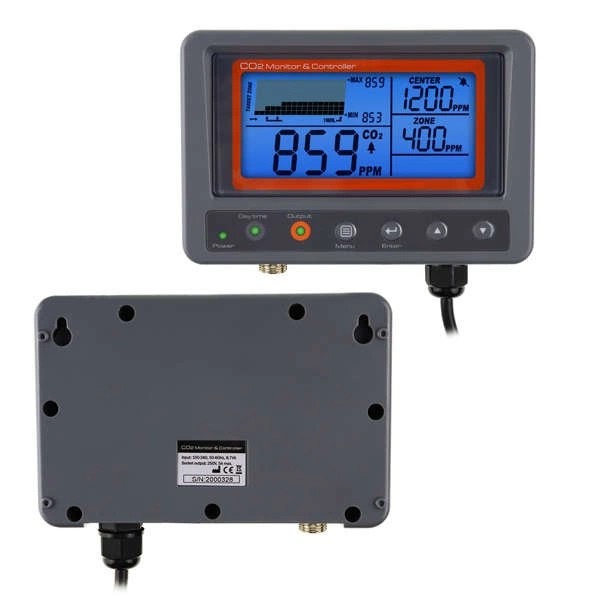 The digital CO2 controller is an easy-to-use controller to measure and maintain CO2 levels in a greenhouse or growing room: large digital LCD screen where levels can be read in real time ppm, day, hours, minutes, alarms, etc. This screen is divided into zones which make it much easier and faster to locate the parameter reading.