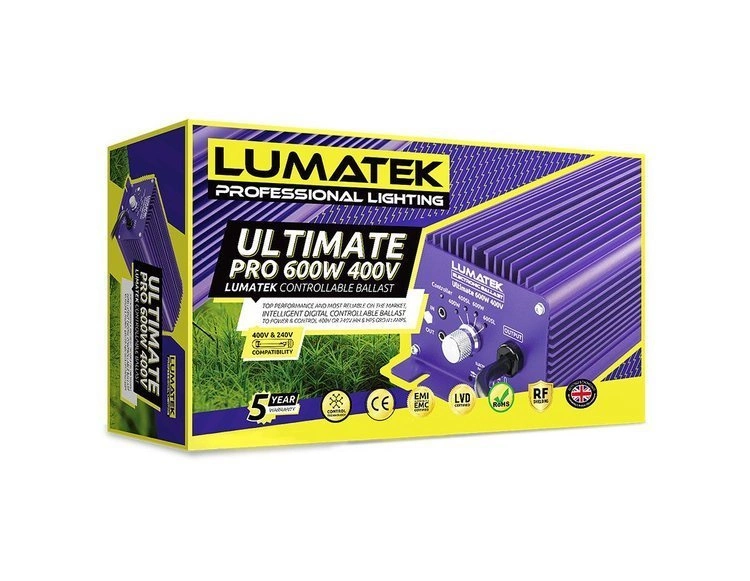 The Lumatek Ultimate Pro 600W (model LUMBC003) is a premium digital ballast designed for professional indoor horticulture. It supports both 240V MH/HPS lamps and 400V HPS lamps, automatically detecting and powering the connected bulb for maximum efficiency and performance.