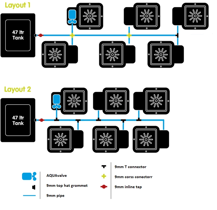 The tank should be placed at least 15cm higher than the pots to allow gravity pressure to effectively water the system.