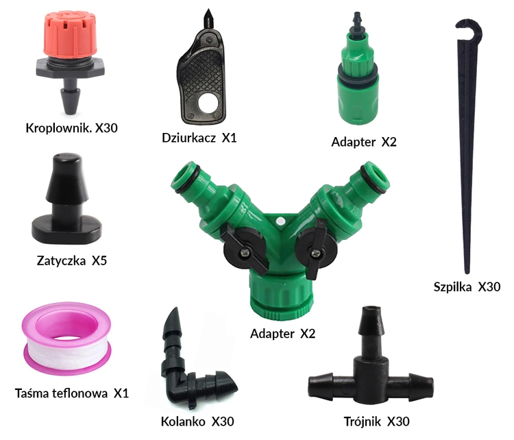 1x Water Timer - irrigation system programmer 1X Hose 30m, diameter 6mm 30x drippers with adjustable flow (6mm connection) 1X hose punch (makes 6mm holes (compatible with the drippers included) 2X Adapter to 6mm 1/4 "(Adapters should be connected to the splitter included in the kit) 30X pin for 6mm hose (The pin allows for easier hose installation) 1X divider 3cm 3/4 "to 6mm 1/4". (The manifold is installed directly in the tap) 5X end plug for 6mm hose (The plug allows you to stop / close the water circuit at the end of the hose so that no water runs out of the end of the hose ) 1X tape to insulate the joints (Used to insulate the connection between the individual elements 5X elbow 6mm (The elbow allows you to change the direction of the tubing by 90 degrees without bending the tubing) 30X T-connector for 6mm (The connector allows the hose to branch out) |