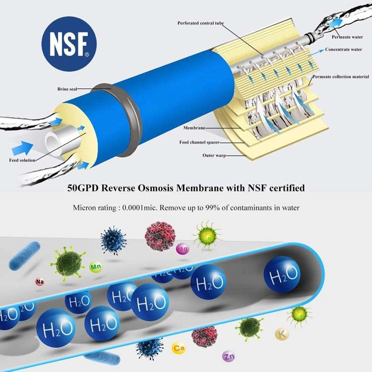 The standard dimensions of the membrane allow it to be used in most kitchen RO filters, efficiency 50 GPD (up to 190 liters per day).