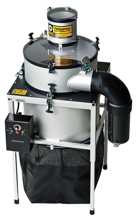 TrimPro Automatic is a device designed to automate work after the harvest period. The device cuts the leaves with a rotating blade which is separated from the plant material by a stainless steel grate. After starting the electric motor, just pour the material into the first chamber, then release the lock, the material falls into the cutting chamber and there it is moved over the knife with a special drum, if you find that there are no more unwanted leaves, you open another chamber where it collects shaved fabric.
