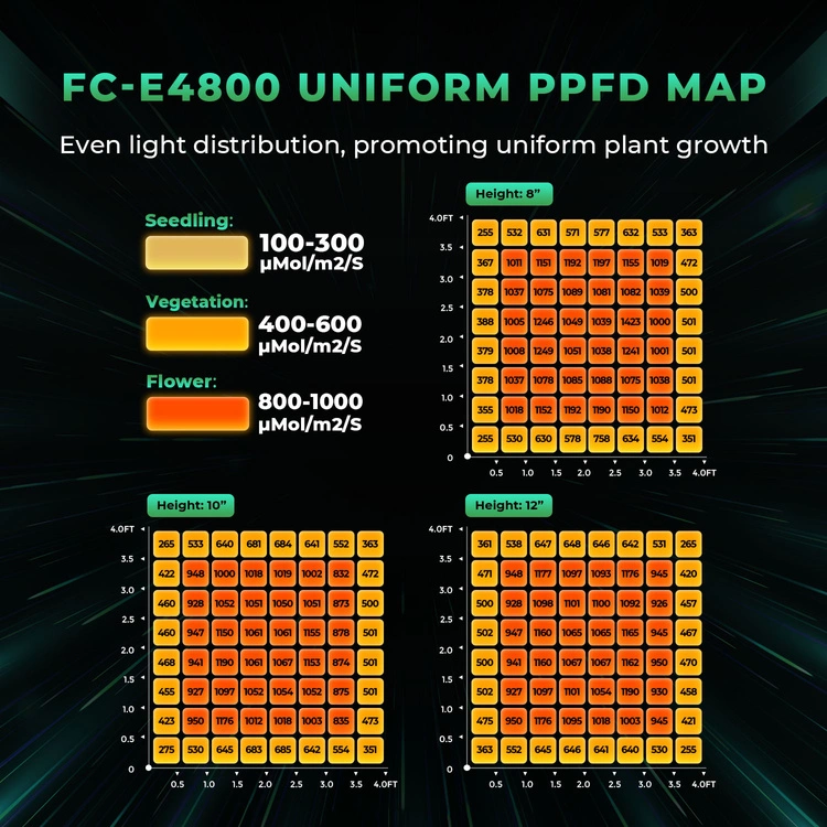 - Full Spectrum Grow Lighting– full spectrum with Yield Max spectrum (660-665nm, 2800k-3000k, 4800-5000k), which includes mainly in the PAR range (400-700nm), the FC-E4800 LED grow light activates photosynthesis and provides enough light for plants to grow stronger and healthier.