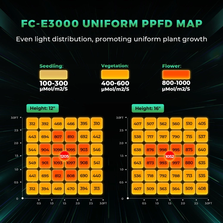 - Market-Leading Efficiency – Boasting a market-leading status, the FC-E3000 LED Grow Light is a cost-effective solution with 2.8 µmol/J PPE and Max 2.5g yield/watt. Giving a high PPF of 840umol/S and suiting for 3’x3′ Veg Coverage and 2.5’x2.5′ Flower Coverage with 1-3 plants.