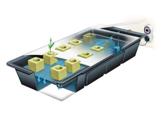 This is an active hydroponic system very often used in commercial cultivation of various plants. Plants grow on trays, into which the nutrient solution is pumped at the bottom, creating a thin film at their bottom containing all the necessary nutrients for the plants.