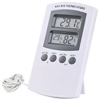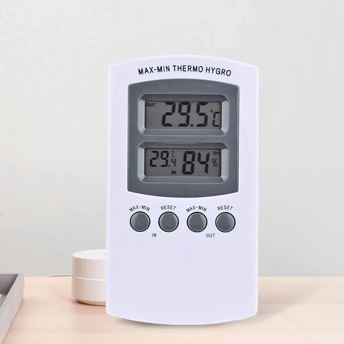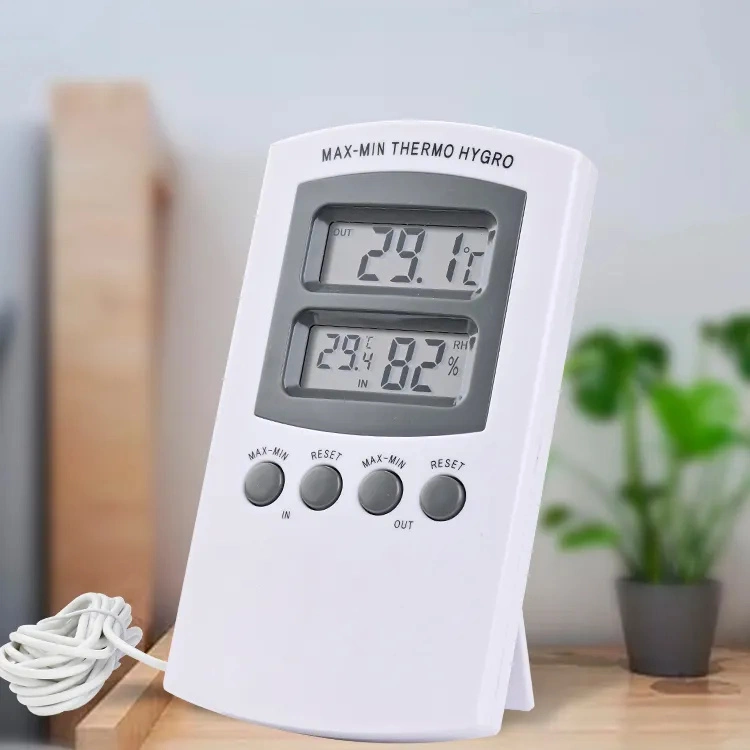 The digital thermometer/hygrometer has a hanging hole and a foot.