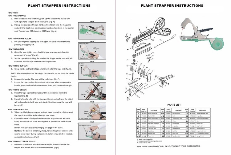How to Bind Objects: Press the tape against the object until it is positioned inside the tapetool. Press the handle fully with the tape positioned centrally until you feel a crunch and the object will be bound with both tape and staple. Simultaneously the tape will be cut off. You can now easily strap top heavy plants and perform rapid strapping effortlessly. How to Load new Staples How to Load New Staples: Hold the device with left hand, push up the knob of the pusher unit with right hand and pull it out backwards. Pick up the staples with right hand and load them into the magazine unit with the staple legs pointing downward and set them in the pusher unit. You can load 200 staples of 604C type.
