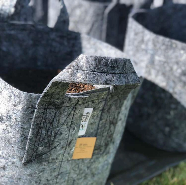 Root Pouch plant pots are made of PETE (polythehylene terephthalate) derived from plastic bottles. This material is spun into fibers that are mixed with recycled cotton fibers, which degrade harmlessly over time. The resulting geotextile is available in four versions, each with a different degradation schedule—from six months to six years.