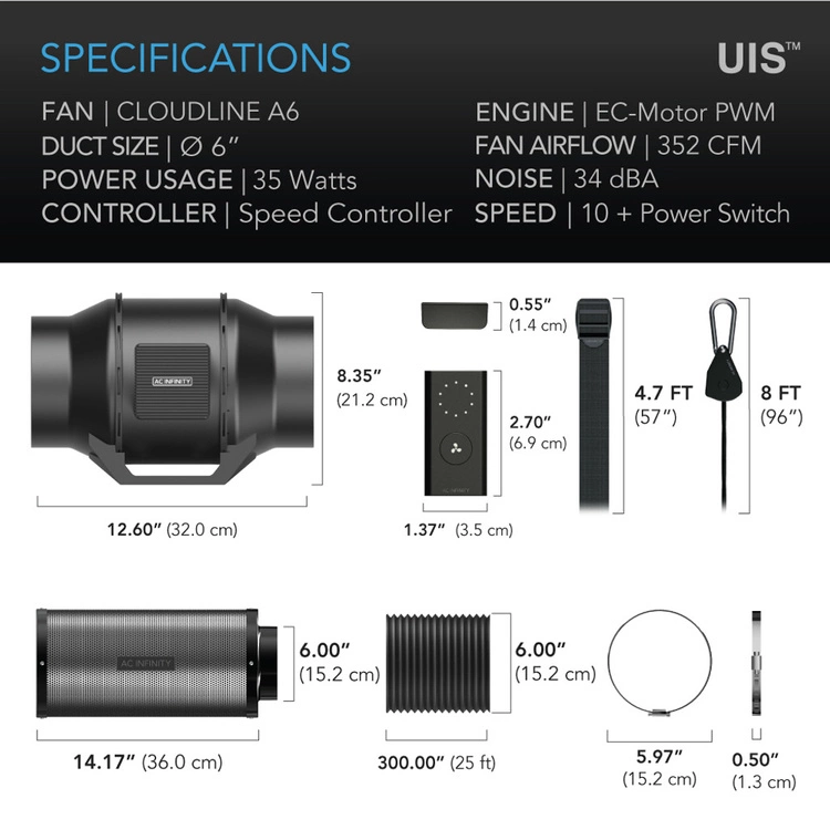 A grow tent air filtration system with all the necessary inline components you need to ventilate your grow space. By assembling these essential pieces, this package will help you quickly get your grow build started and eliminate the guesswork of purchasing them individually. This inline fan kit features the CLOUDLINE Series fan with 10-speed controller, capable of delivering powerful yet quieter performance. Paired with a carbon filter using Australian virgin charcoal to block odors from seeping out of your grow tent. These two pieces are connected by a set of flexible ducting with four layers of protection to properly direct airflow away. Accessories include duct clamps, prefilter cloth, rope clip hangers, and hanging straps to complete the installation. This product is a part of the UIS™ platform of grow devices and smart controllers, designed to integrate with each other to achieve your ideal environment.