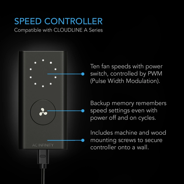 A 10-speed fan controller is paired with this inline fan to optimize airflow levels and noise in many applications. The fan’s PWM controls enable it to smoothly set fan speeds and operate at extremely low RPMs with no motor noise. Along with this wired speed controller, the CLOUDLINE is also compatible with many AC Infinity controllers, including 69 PRO CONTROLLER which you can find in our store.