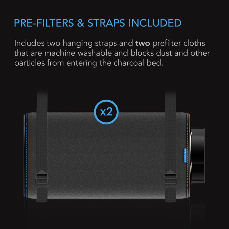 A high-airflow duct filter designed to eliminate odors and chemicals, utilizing a premium-grade Australian Virgin charcoal bed. This activated carbon bed has RC412 pore sizes that enable a high adsorption rate and longer life rating. Its heavy-duty construction features aluminum flanges and dual-sided galvanized steel mesh with a rust-resistant gunmetal finish to stand up to corrosion and high humidity. The carbon filter can be used with an inline duct fan for use in intake and exhaust configurations, while its flanges can be reversed to further prolong its lifespan. Includes two machine-washable pre-filter cloths to prevent carbon residue and two hanging straps for easy installation.