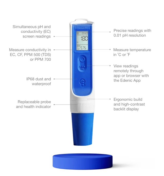 This 3-in-1 tool measures pH, conductivity (EC/PPM) and temperature, optimizing nutrient absorption. Connect to the Edenic app via Bluetooth to share, update and manage real-time data.