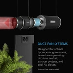 - Designed to ventilate hydroponic grow rooms, transfer heating/cooling, cool AV closets, and exhaust odors.