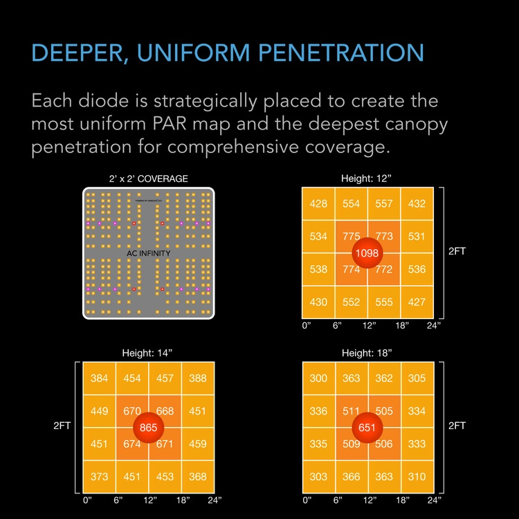 - Algorithmically positioned diodes create the most uniform PAR map and the deepest canopy penetration.
