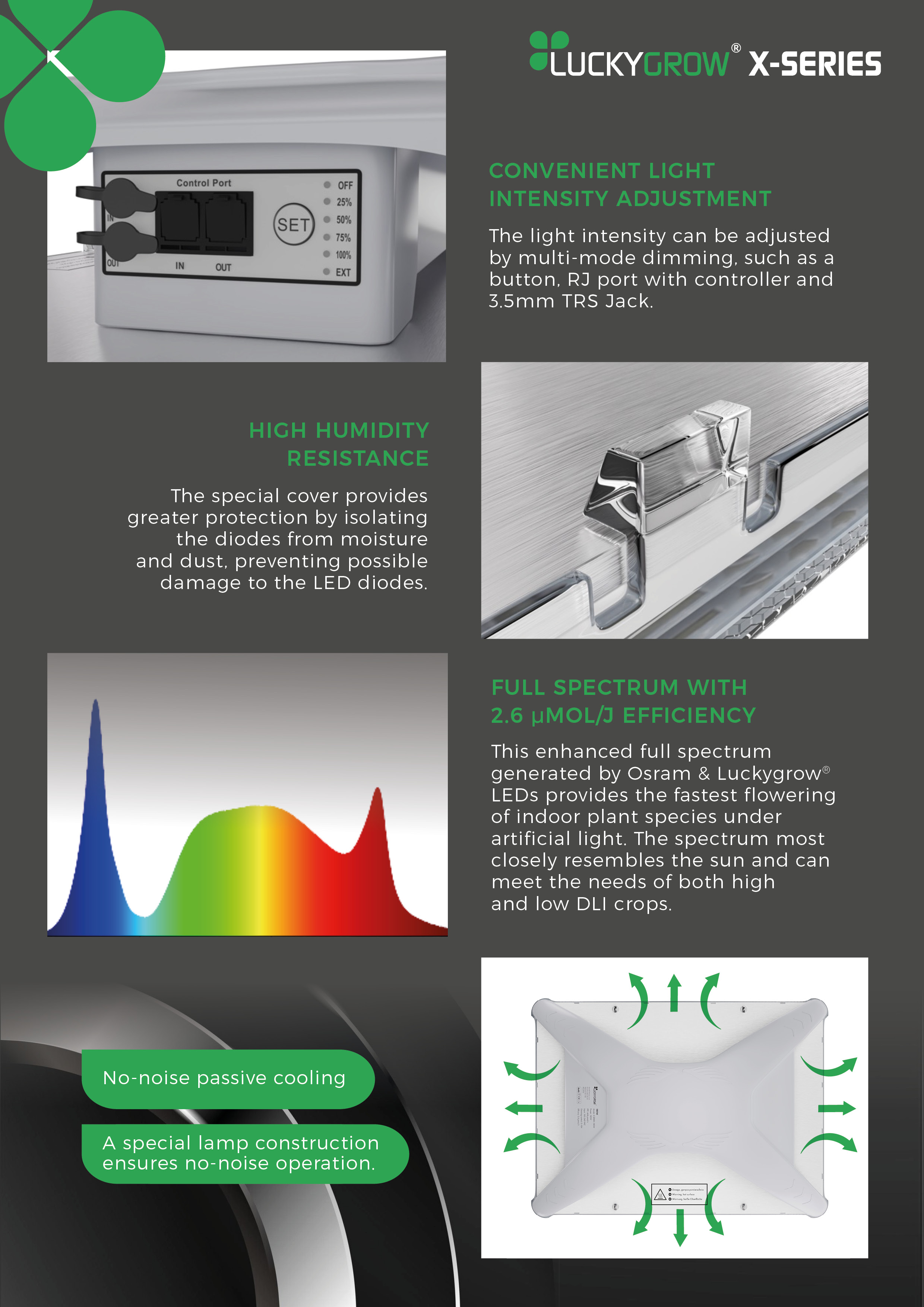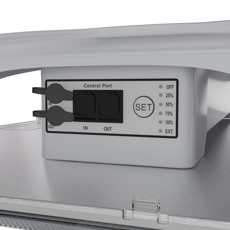 - Light intensity adjustment: Three dimming interfaces (manual, via 3.5 mm Jack connector and RJ12 connector) allow for precise adjustment of the light output to the needs of plants.