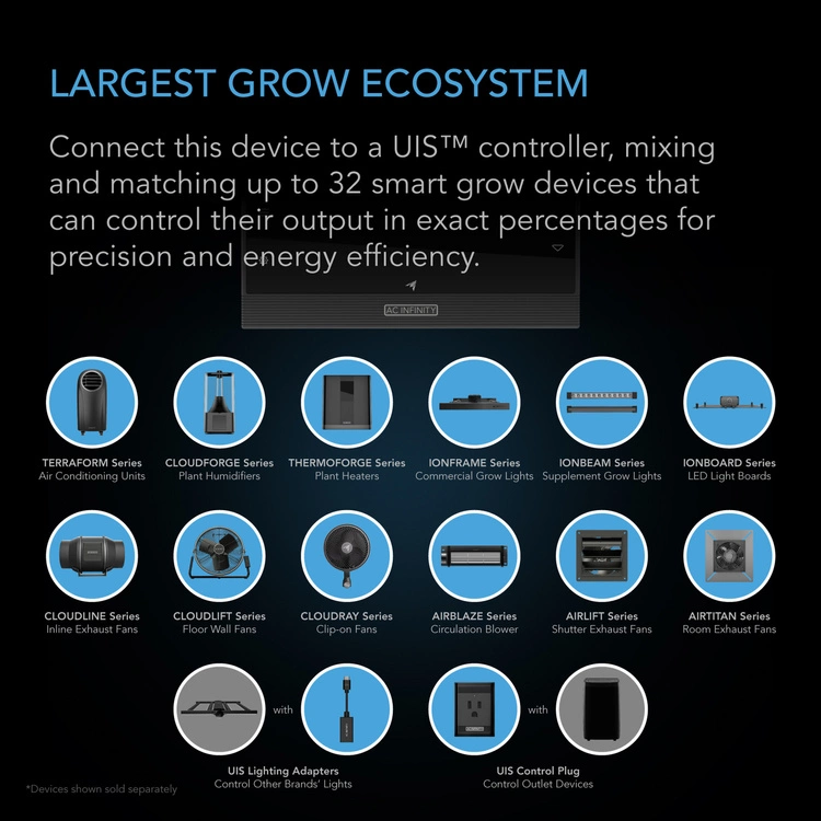 A highly innovative clip fan designed to deliver targeted circulation and optimize each stage of your plant’s grow cycle. Access ten digital speeds plus ten dynamic wind modes for customizable airflow that varies between levels to simulate an outdoor environment. For even greater control, utilize the ten oscillation levels that deliver focused circulation to specific spots or offer the widest reach possible. This circulation fan is IP54-rated to maintain peak performance during continuous use in high humidity and temperature. It also meets ETL standards (certificate #5027708) for electrical appliance safety, ensuring secure use in air circulation applications. This product is a part of the UIS™ platform of grow devices and smart controllers, designed to unite with the AC Infinity app over WiFi to achieve your ideal environment.