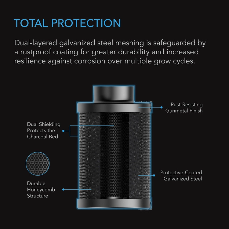 The activated charcoal is safely locked within your odor filter by aluminum flanges and a secure rubber seal. The filter itself employs two layers of galvanized steel meshing with a sandblasted finish to protect the charcoal bedding. These multiple layers work together to effectively block odors in even the most humid environments by ensuring increased resistance to rust and corrosion.