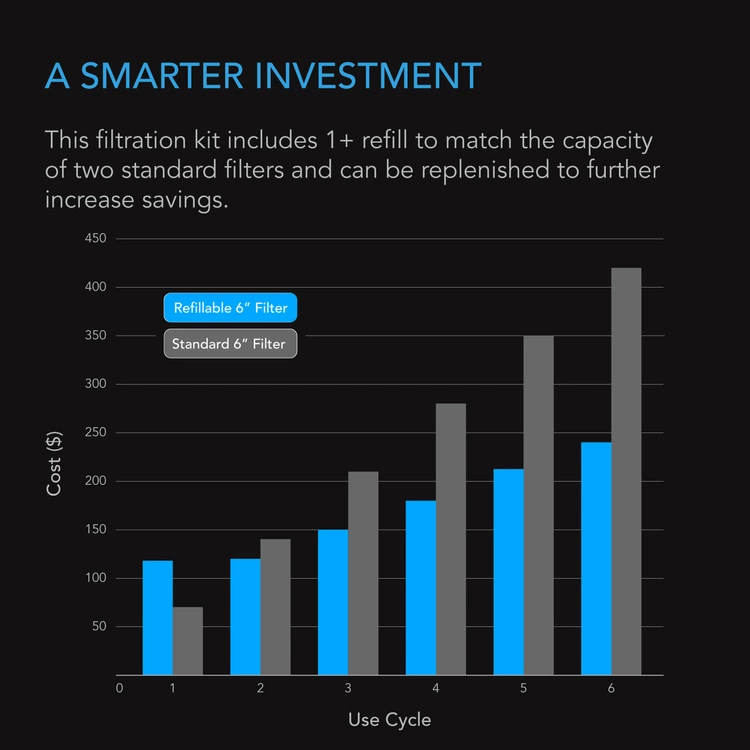 - Includes 1+ refill to match the filtration capacity of two standard 4” carbon filters while costing less.