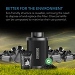 This first-of-its-kind filtration system removes the need to routinely purchase replacement filters and dispose of the old units. Each carbon filter features premium-grade Australian virgin charcoal and comes with 1+ refill. Its activated charcoal utilizes an enhanced surface area with a higher adsorption rate to help extend the time between refills. Further lengthen the charcoal bedding’s lifespan by reversing the filter’s easy-to-remove flanges. You can compost the used supply when replacing the charcoal to maximize its utility even further.