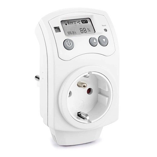 It has two functions, humidifier control mode and dehumidifier control mode, and either of the two devices can be connected to the controller. It is digital and displays the humidity reading of the room, allowing effective control of the humidifier/dehumidifier that is connected at that moment.